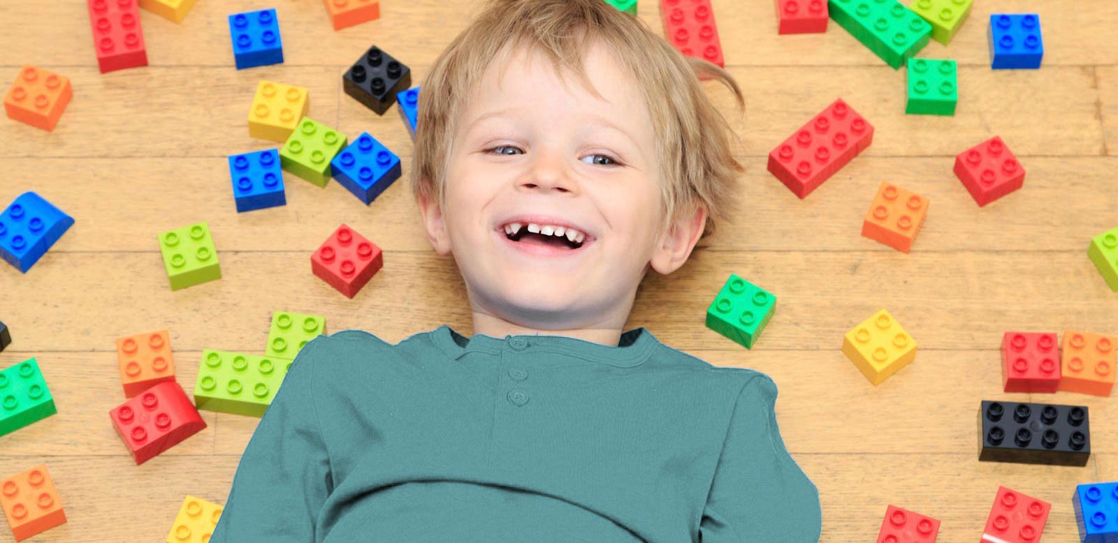A képen egy kisfiú látható, amint mosolyogva legó kockák között fekszik.