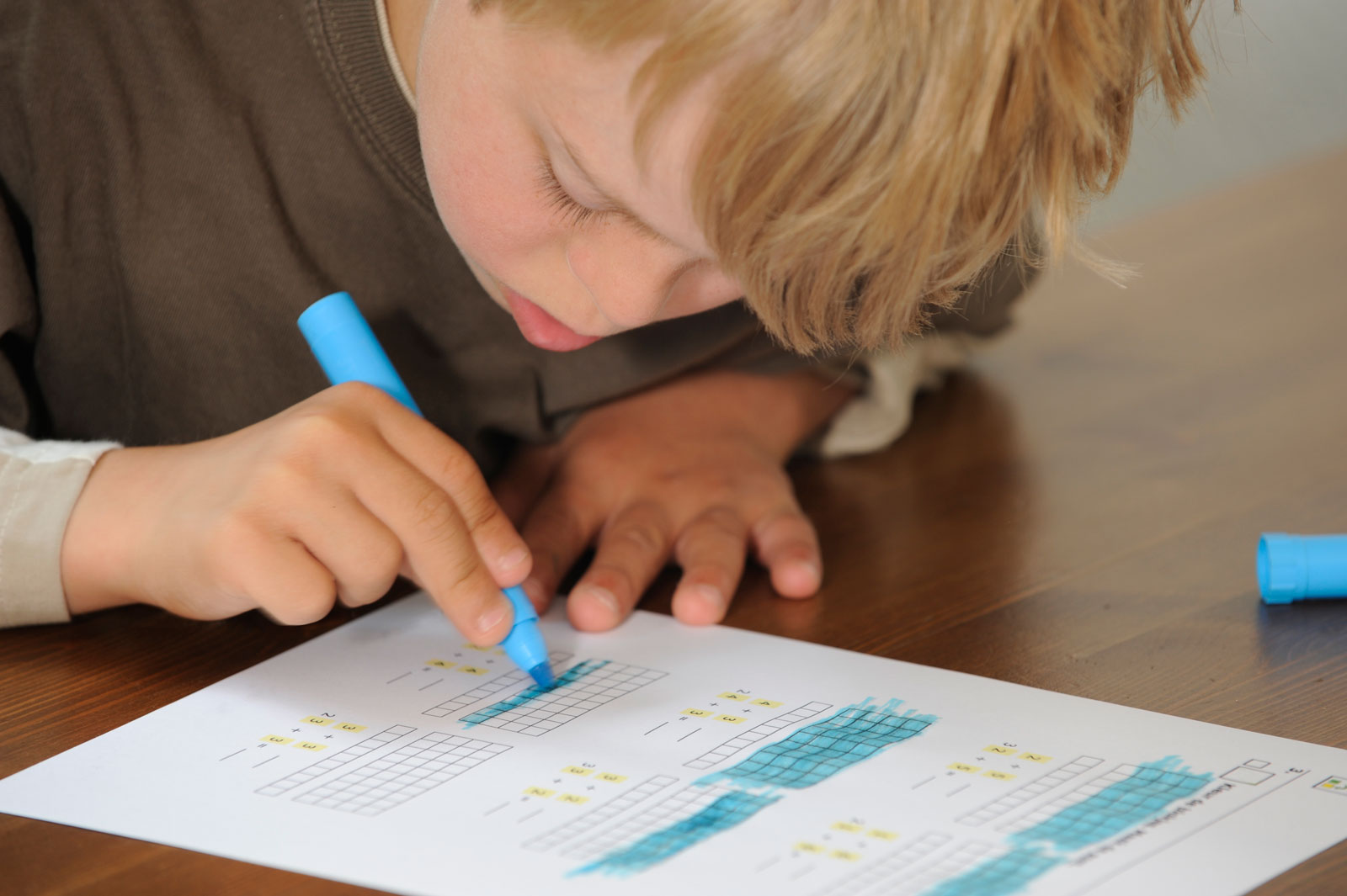 a képen egy down szindrómás kisfiú látható tanulás közben. egy kék filccel színez ki kockákat.