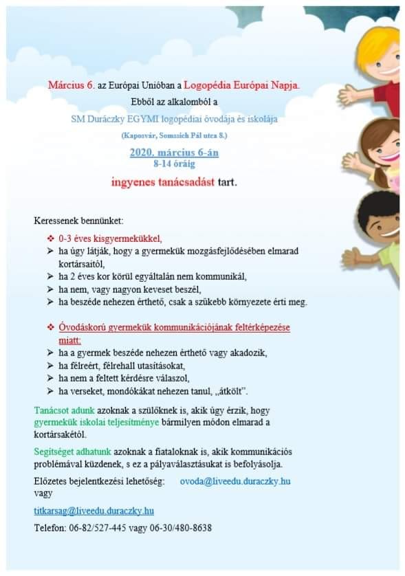 Március 6. a Logopédia Európai Napja. Ebből az alkalomból a Somogy Megyei Duráczky József Óvoda, Általános Iskola, EGYMI ingyenes tanácsadást tart.