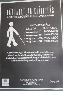 A Szent-Györgyi Albert Agóra Láthatatlan kiállításán élethűen berendezett lakásban, teljes sötétségben tapasztalható meg a látássérült, vak emberek élethelyzetei, mindennapjai.